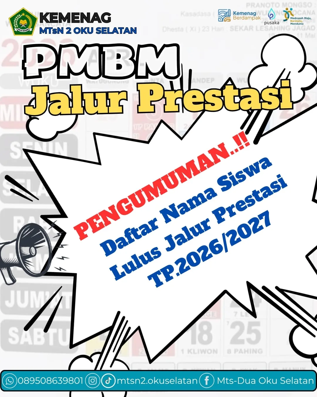 Alhamdulillah, hasil seleksi Penerimaan Murid Baru Madrasah (PMBM) Jalur Prestasi MTs Negeri 2 OKU Selatan Tahun Pelajaran 2026/2027 telah resmi diumumkan.